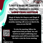 Tlingit & Haida WA Chapter (nonprofit) and T&H Seattle Community Council monthly meeting will occur on March 5th, 2026, at 5:30 PM PST. You’ll need to register; follow the link below to register to attend. Registration Link: https://us06web.zoom.us/…/register/sL1sUQT5S1GVW7LMlLqv9A After registering, you will receive a confirmation email with information on… Read More