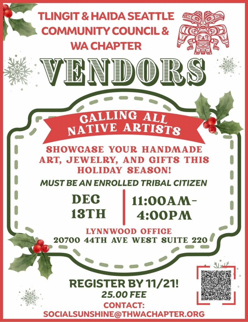 Are you an enrolled tribal artist who is interested in vending at our upcoming Holiday event? Click the link or scan the code, to fill out the registration form below. Where: T&H Lynnwood OfficeWhen: December 13th, 11 AM to 4 PM There is a $25 fee for vendors, and the… Read More