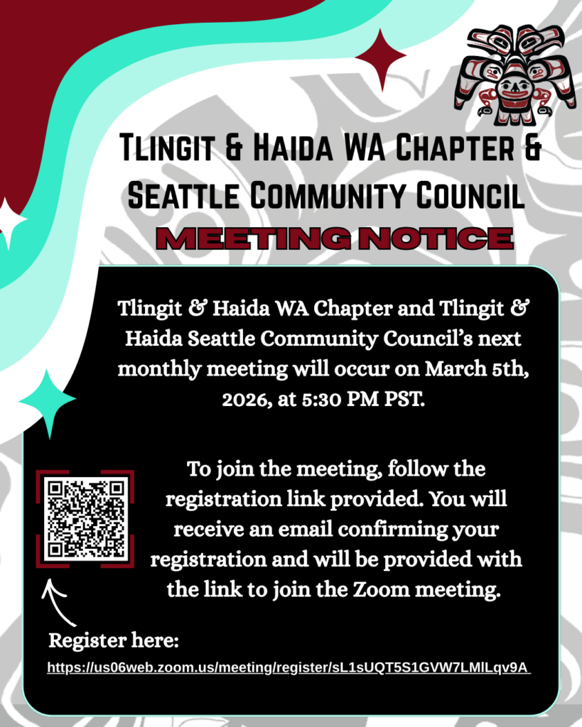 Tlingit & Haida WA Chapter (nonprofit) and T&H Seattle Community Council monthly meeting will occur on March 5th, 2026, at 5:30 PM PST. You’ll need to register; follow the link below to register to attend.